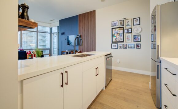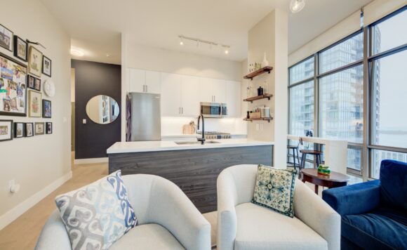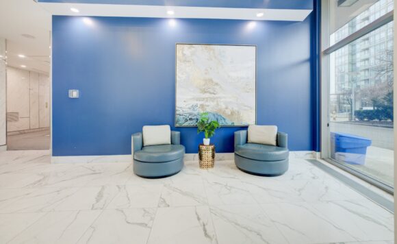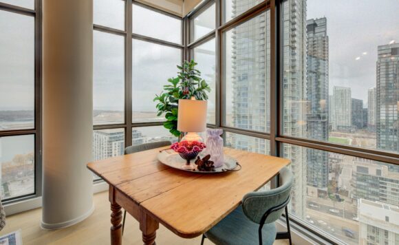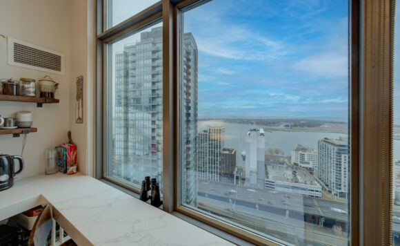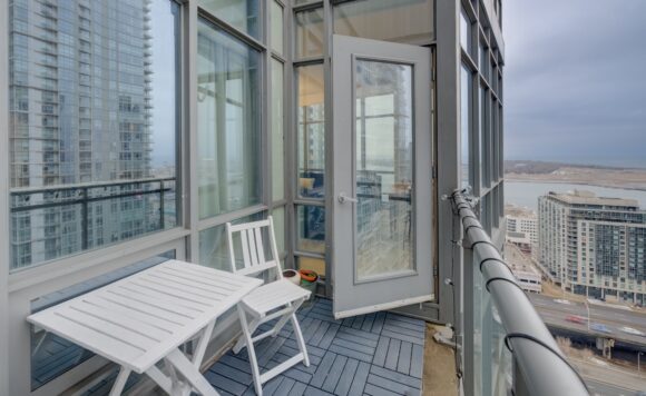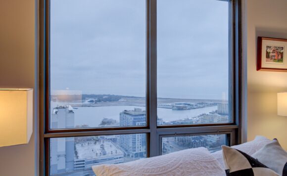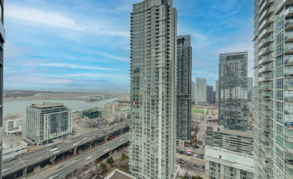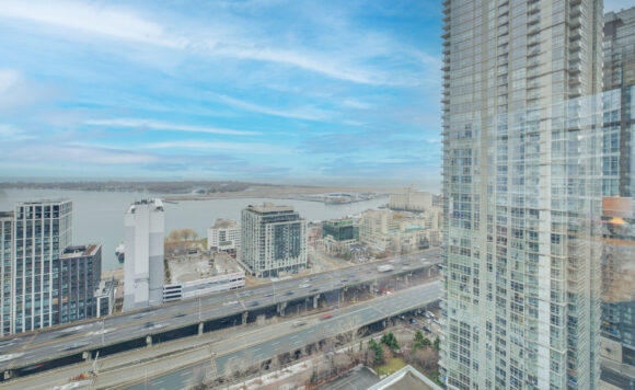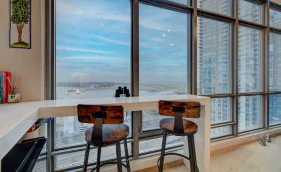 Live at the Lake in a rare Penthouse Corner Suite. Experience elevated living in this stunning penthouse suite featuring 10-ft floor-to-ceiling panoramic windows with breathtaking south views of Lake Ontario & the Island Airport. Located in sought-after Harbour View Estates, residents enjoy exclusive access to the renowned “Super Club”-a separate facility with indoor access offering an indoor pool, gym, BB courts, squash, tennis, & more. This fully renovated home offers approximately 1,100 sq. ft. of thoughtfully designed space, including a bonus room ideal for a home office, complete with 10-ft ceilings & glass French doors. The open-concept kitchen features quartz countertops, stainless steel appliances, a 5-burner gas stove, built-in microwave, breakfast bar with lake views, island stainless steel sink, & a dedicated coffee/beverage bar. The suite showcases high-end 5″ engineered hardwood flooring T/O the living areas, custom window coverings, & a neutral designer colour palette. Both bathrooms have been beautifully renovated with oversized tiles, glass enclosures, & quartz finishes. The primary ensuite feat a rain shower with an oversized glass shower, while the main bath offers a full-sized tub. Two generously sized bedrooms incl double closets, the unit is equipped with full-size ensuite laundry. Penthouse living is complemented by two side-by-side parking spaces, conveniently located just steps from the building entrance. Ideally situated at 3 Navy Wharf, this location is steps to the Rogers Centre, minutes to Scotiabank Arena, the CN Tower, & the Well entertainment district. Quick access to the Gardiner via Spadina, & seamless transit options including GO Train, UP Express, & subway are all nearby. The building offers 24-hour concierge service, an excellent elevator-to-unit ratio with only 30 floors & 3 elevators. If you’re seeking a rarely offered penthouse corner suite with balcony, spectacular lake views, an unbeatable downtown lifestyle, this is it!